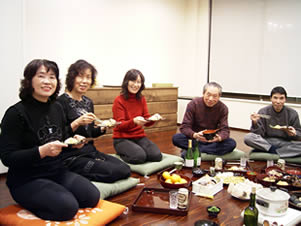 各クラス合同の忘年会。持ち寄りのお料理を漆器に盛り付けていただきました。