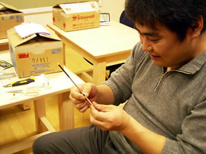 輪島の蒔絵師、中島和彦さんが訪ねてきてくださいました。 鯛牙に柄を付けて仕立てる方法を教えてくださっています。 (*蒔絵の細かい部分を磨くために、鯛の牙を使うのです!) (2004.10.09)